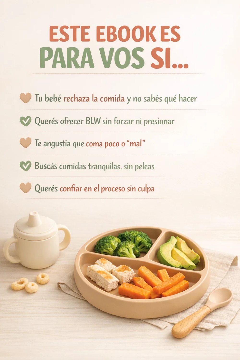 Sí. Este ebook está pensado justamente para bebés selectivos, con poco interés por la comida o que comen muy poco. No busca que “coma más a la fuerza”, sino que las comidas sean tranquilas, seguras y sin presión, respetando su ritmo.